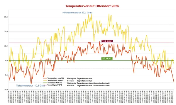 Die Höchsttemperatur war Ende Juni 2025 mit 37,2 Grad zwar höher als 2024 mit 35,7 Grad. Der Juli zeigte sich 2025 aber deutlich kühler, als 2024 und der April 2024 war deutlich wärmer als 2025, was im Summe die Durchschnittstemperatur 2024 doch um 1,5 Grad höher ausfallen ließ als 2025.