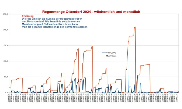 Die Detaildiagramme zeigen die wöchentliche Regenmenge (blau) und die monatliche Regenmenge (rot). Beide Kurven starten jeweils am Wochen- bzw. Monatsanfang bei Null und bilden dann die Regenmenge innerhalb dieses Zeitraums ab.