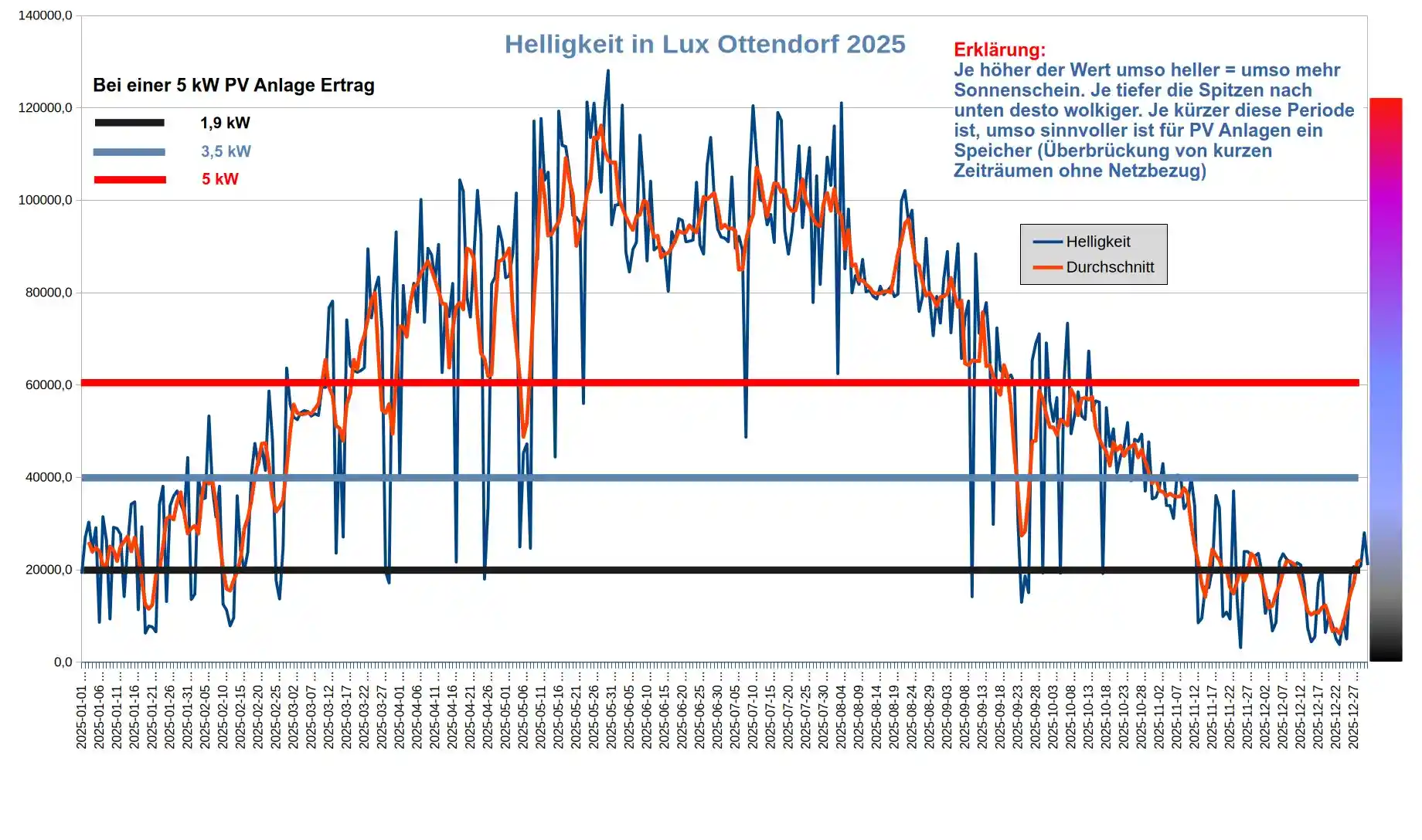 Der Helligkeitsverlauf zeigt die Sonneneinstrahlung in Lux. Im Diagramm sind Schwellenwerte eingetragen, die eine grobe Orientierung geben sollen – insbesondere für PV-Interessierte –, welche Erträge eine 5 kW PV-Anlage mit Ost-/West-Ausrichtung (zwei Stränge) ungefähr bei bestimmten Helligkeiten liefern kann.