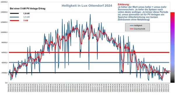 Der Helligkeitsverlauf zeigt die Sonneneinstrahlung in Lux. Im Diagramm sind Schwellenwerte eingetragen, die eine grobe Orientierung geben sollen – insbesondere für PV-Interessierte –, welche Erträge eine 5 kW PV-Anlage mit Ost-/West-Ausrichtung (zwei Stränge) ungefähr bei bestimmten Helligkeiten liefern kann.