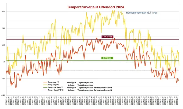 Die Höchsttemperatur war Ende Juni 2025 mit 37,2 Grad zwar höher als 2024 mit 35,7 Grad. Der Juli zeigte sich 2025 aber deutlich kühler, als 2024 und der April 2024 war deutlich wärmer als 2025, was im Summe die Durchschnittstemperatur 2024 doch um 1,5 Grad höher ausfallen ließ als 2025.