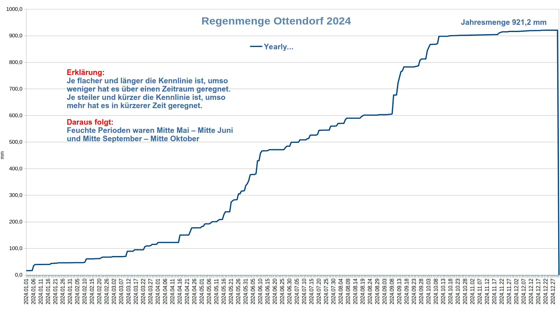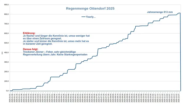 Der kumulierte Regenverlauf zeigt die aufsummierte Regenmenge über das Jahr. Das macht Phasen mit Starkregen (steiler Anstieg) und Trockenperioden (flacher Verlauf) besonders gut sichtbar.