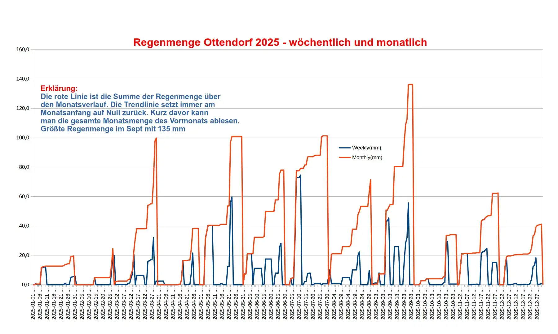 Die Detaildiagramme zeigen die wöchentliche Regenmenge (blau) und die monatliche Regenmenge (rot). Beide Kurven starten jeweils am Wochen- bzw. Monatsanfang bei Null und bilden dann die Regenmenge innerhalb dieses Zeitraums ab.